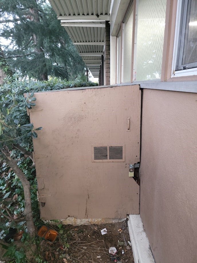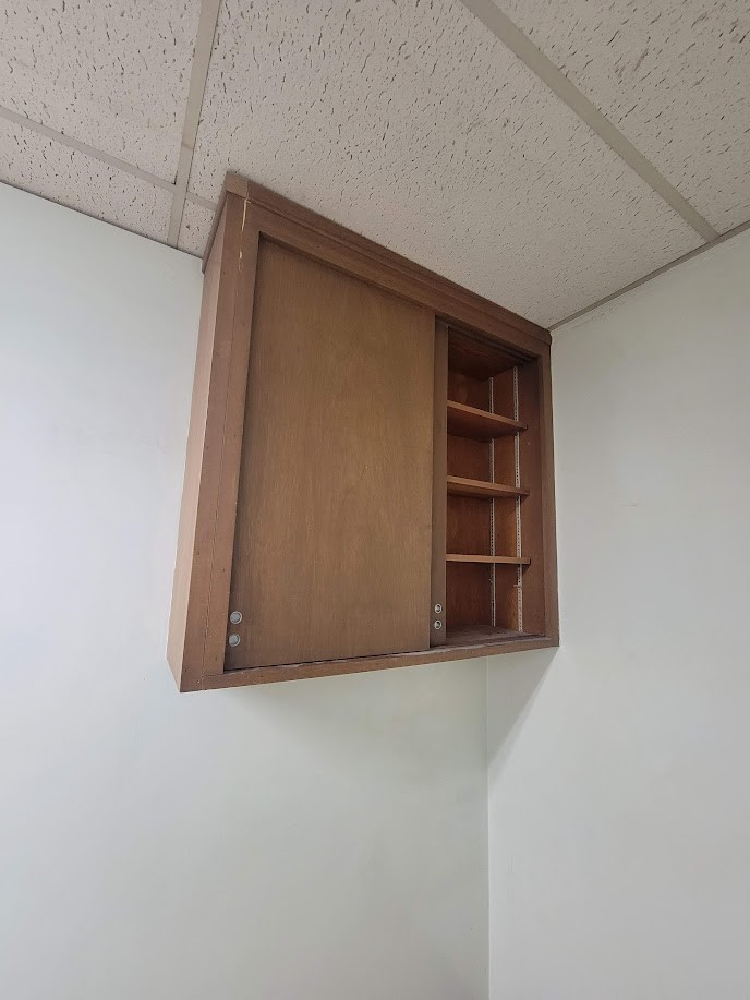 7. remove the bathroom door as it is not accessible for a wheelchair, demo the brown cabinet and build drywall and new wheelchair accessible door