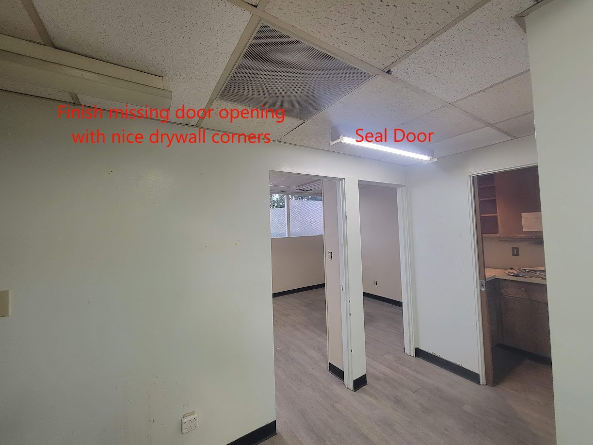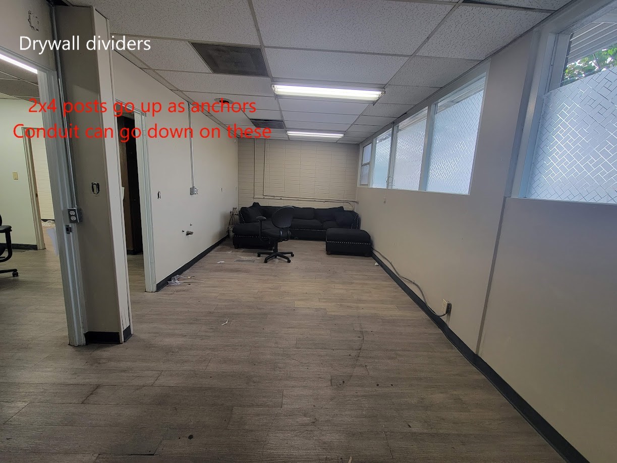 2. Build 2 drywall dividers, 6 to 7ft wide, by 7' tall. they need to be reinforced to the ceiling with a 2x4. see picture, there's utility space above the acoustic ceiling.