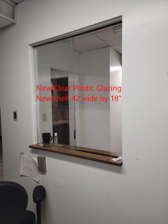 8. receptionist window - new wider wood shelf and folding shelf 24"x18" (disabled patient paperwork), new partial clear shield